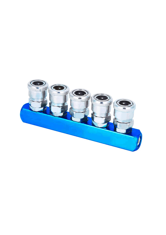 کوپلینگ مادگی پنج راهی بلوکی امکان اتصال پنج مصرفکننده بادی به کمپرسور را به طور هم زمان فراهم میکند.