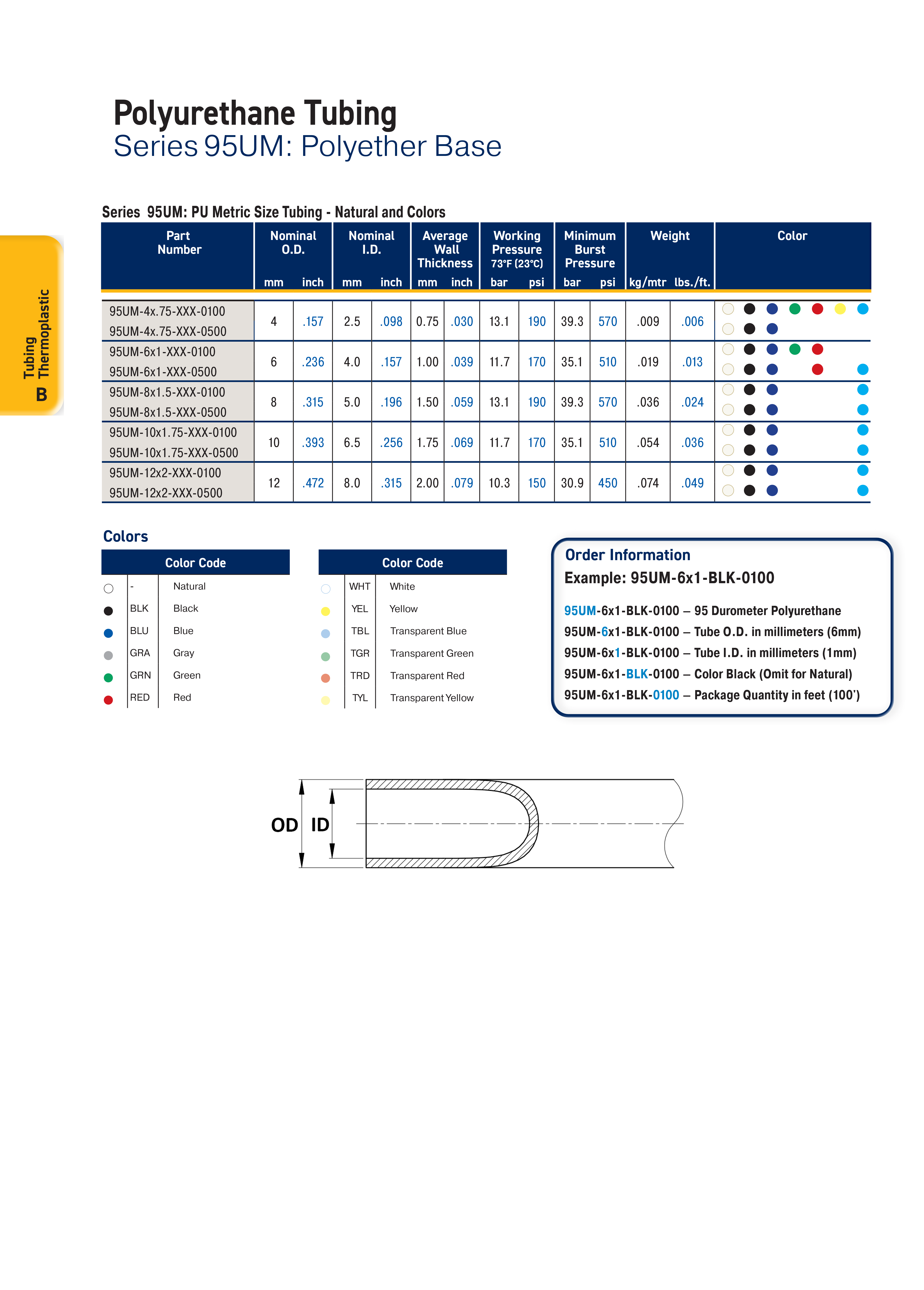 شیلنگ پلی اورتان پارکر (PARKER Polyurethane Tubing) سری 95U/95UM: پلی اورتان ویژگیها • سختیسنج ۹۵ Shore A • مقاومت عالی در برابر سایش و پیچخوردگی • مقاومت عالی در برابر رطوبت • مونتاژ آسان با اتصالات تأیید شده • ساخته شده از پلییورتان مقاوم در برابر اشعه ماوراء بنفش نکات • ویژگیهای ازدیاد طول و بازیابی لاستیک و • مقاومت شیمیایی ترموپلاستیک را نشان میدهد • جعبههای ۱۰۰ فوتی EZ Pack موجود است • محدوده دمای عملیاتی پیشنهادی از -۴۰ درجه فارنهایت (-۴۰ درجه سانتیگراد) تا ۱۸۰ درجه فارنهایت (۸۲ درجه سانتیگراد) است – نمودارهای مرجع فشار در مقابل دما زیرا فشارها در دماهای بالاتر کمتر هستند • فشار کاری و فشار انفجار در ۷۳ درجه فارنهایت (۲۳ درجه سانتیگراد) هستند
